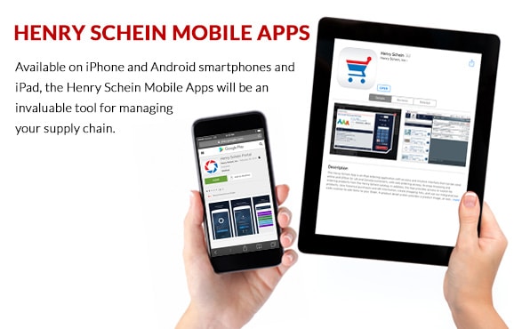 Want to take ordering right to the supplies closet? Just left the office computer and realized you forgot to place your supplies order? We have the solution! Simply launch one of the Henry Schein Mobile Medical Apps from your smartphone or iPad! Designed with an easy, intuitive user interface, these mobile ordering applications make it both easy and convenient to browse the Henry Schein catalog and place orders anytime, anywhere! From your smartphone or iPad, you can search for products, view historical purchases, access invoices and A/R account information, and use the barcode scanning feature to scan items directly to your order! A product detail screen provides helpful information such as product image, estimated delivery date, and inventory availability! Available to existing Henry Schein web customers and can be downloaded to iPad, iOS, and Android smartphones. Just use your existing Henry Schein web login to go mobile with Henry Schein!