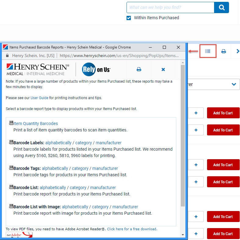 Barcode Labels are available to you for all items that have been previously purchased. There is a barcode icon at the top of the "Order from History Page," which allows you to generate and print barcodes in PDF format.