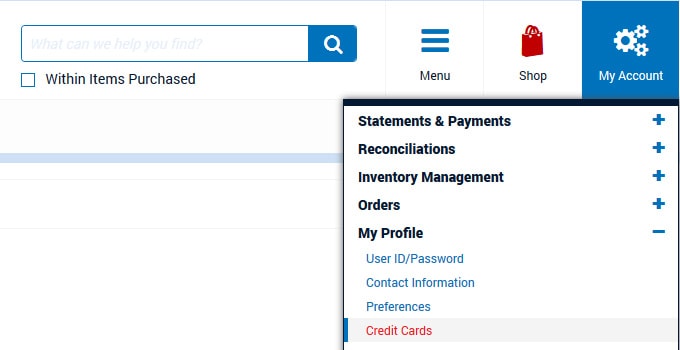 Credit Cards can be added to your profile by going to My Account > My Profile > Credit Cards > Add Credit Card.