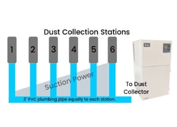 It may seem counter-intuitive, but flow is a major concern when designing a proper suction system. Use too small of a pipe to your workstations and your suction will be limited (think of using a stir-straw to sip on a milkshake), go too big and the farthest stations from the dust collector won't get power. This is often an issue with many labs as you'll find some workstations not getting enough suction when other stations are open as well as other suction-related issues. The goal should be to provide an equal amount of suction to each station regardless of which or how many stations are in use. Take for example a six-station setup with all the stations next to each in a line. If you run the same size trunk line (the main supply pipe) and "T"-off to each station using the same sized piping, station six will receive a large majority of the suction while station one, all the way at the end, will be left with little to no suction.
