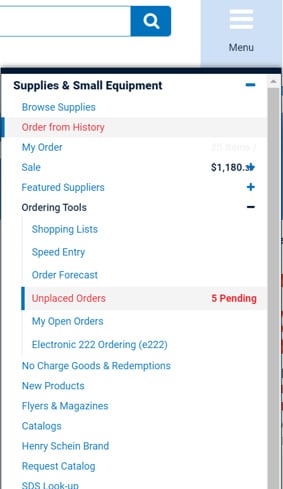 Orders pending approval can be located under Menu > Supplies > Unplaced Orders.