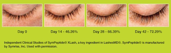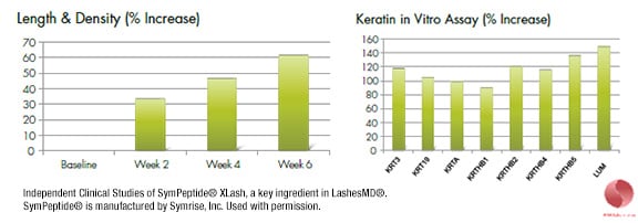 Estudios clínicos independientes de SymPeptide® XLash, un ingrediente clave de LashesMD®. SymPeptide® es un producto fabricado por Symrise, Inc. Utilizado con permiso. Promueve el crecimiento de pestañas y cejas naturalmente más gruesas y con un aspecto más espeso, en un lapso de cuatro semanas. Acondiciona las pestañas y ayuda evitar que se quiebren y a protegerlas de los daños causados por el medio ambiente. Formulado especialmente y con un pH balanceado para no irritar los ojos.