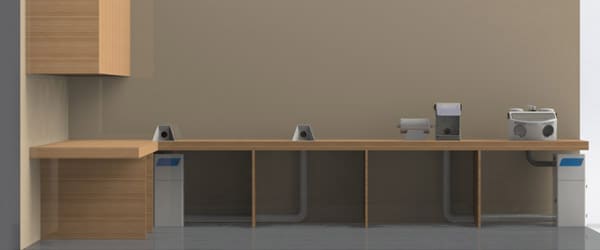 Let's take a look at this same six-station setup. If we decrease our trunk line from 3" to 2.5" after station 2, then again down to 2" after station 4, we'll better be able to equally distribute the suction since the stations further away from the dust collector use smaller piping which balances out the air flow in the system. Of course each dental lab will have its own unique design and approach, but the concept is the same— to maintain a proper balance throughout the system. It's important to note that the bench design you choose will also play a big role in plumbing your system. Benches or workstations that are able to have modifications are usually best and offer you flexibility when setting up equipment. Need more help? If you are in need of lab suction design, ask your rep to use the Vaniman Design Center. We offer a free design service where one of our staff members will help you design your lab suction system and provide you with detailed diagrams and descriptions of everything you'll need to complete your custom setup. Simply reach out to your rep or visit our Design Center page for more info.