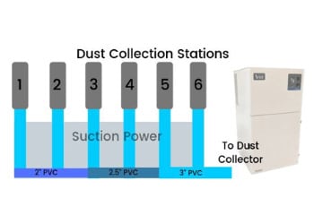 It may seem counter-intuitive, but flow is a major concern when designing a proper suction system. Use too small of a pipe to your workstations and your suction will be limited (think of using a stir-straw to sip on a milkshake), go too big and the farthest stations from the dust collector won't get power. This is often an issue with many labs as you'll find some workstations not getting enough suction when other stations are open as well as other suction-related issues. The goal should be to provide an equal amount of suction to each station regardless of which or how many stations are in use. Take for example a six-station setup with all the stations next to each in a line. If you run the same size trunk line (the main supply pipe) and "T"-off to each station using the same sized piping, station six will receive a large majority of the suction while station one, all the way at the end, will be left with little to no suction.